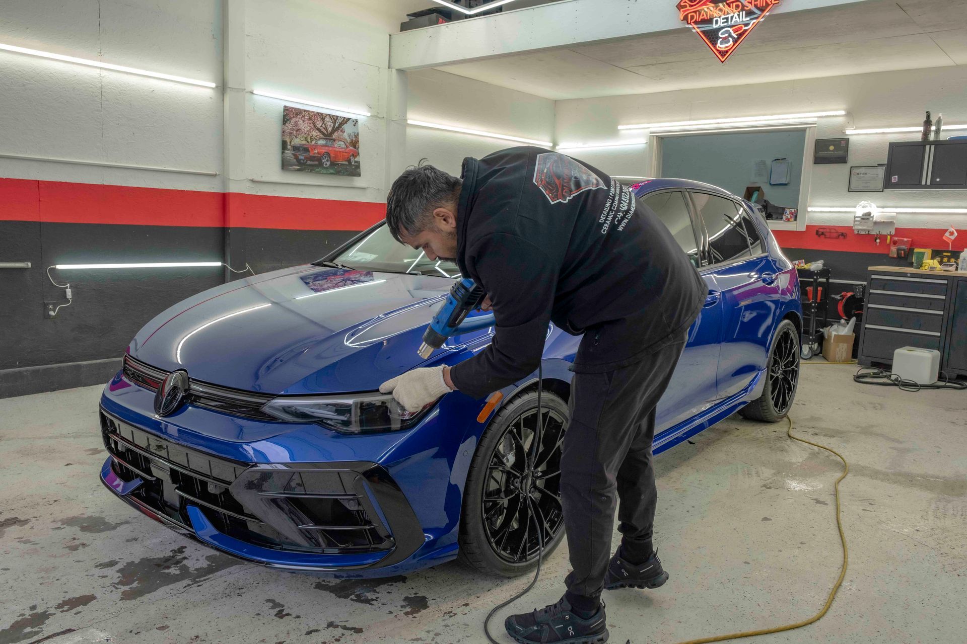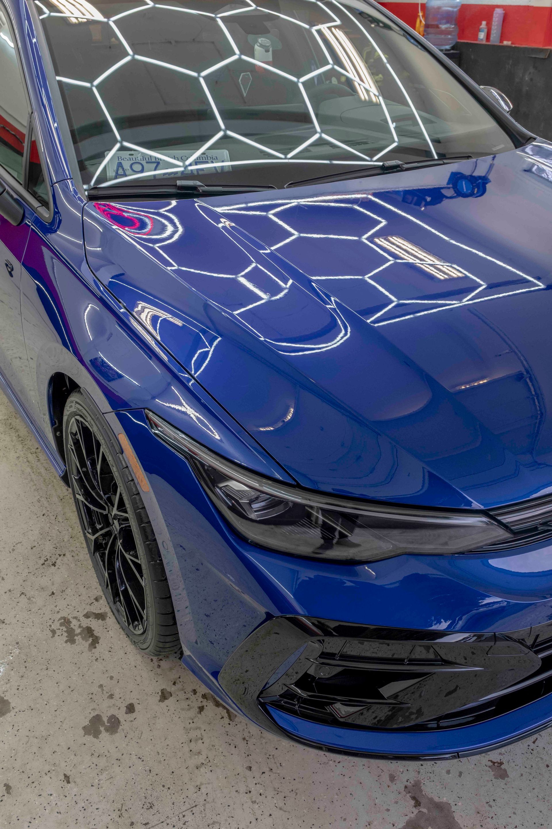 Once applied, the film settles into the paint in a way that keeps the metallic flake sharp and undistorted. Under the overhead lighting, reflections stretch across the hood and bumper without distortion or hazing. Edges are pulled tight into panel gaps, leaving the finish looking untouched, just reinforced. The result is protection that remains visually silent.